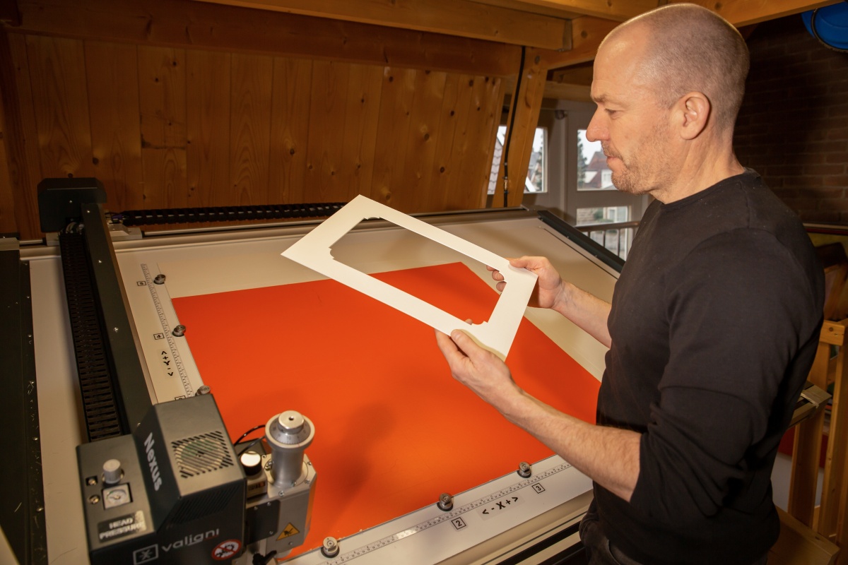 Sinds april 2021 staat er een nieuwe passepartout snijder in de werkplaats. De Valiani Nexus, een reus onder de passepartoutsnijders. We waren de eerste in Nederland die deze machine in gebruik mochten nemen. De mogelijkheden zijn nu eindeloos wat betreft vormen en versieringen op het passepartout.